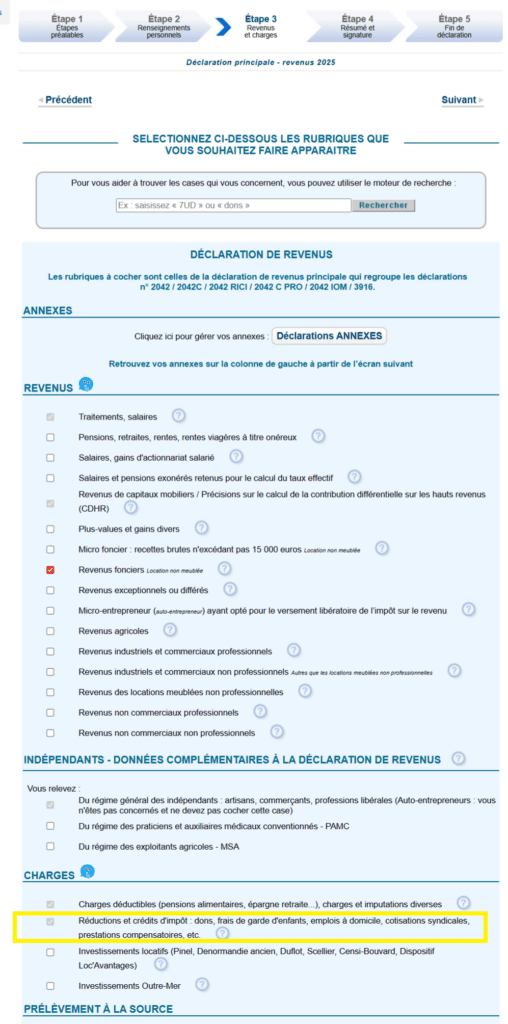 puis sélectionnez , la case « Réductions et crédits d’impôt : dons, frais de garde d’enfants, emplois à domicile, cotisations syndicales, prestations compensatoires, etc. » dans le titre « CHARGES »